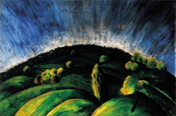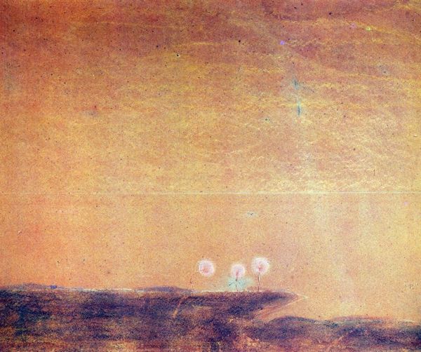 Editor: We’re looking at “Day,” a pastel painting by Mikalojus Konstantinas Čiurlionis from 1904. The earthy tones against the dreamy sky give it this otherworldly yet familiar feel. It reminds me of a landscape seen through a child’s imagination. What's your take? Curator: Child's imagination...yes! Precisely. Čiurlionis was such a mystic. For me, "Day" sings a song of transition, the hazy border between what is tangible and what is dreamed. Those clumps of verdant trees almost feel like figures, guarding some secret, perhaps? Editor: A secret... intriguing! I hadn't thought of the trees as figures. Do you think the lack of sharp lines contributes to that dreamlike quality? Curator: Absolutely. Look how he's blurred the boundaries. And the color palette! He whispers of Romanticism and Symbolism, wouldn't you agree? Colors become feelings; landscapes turn into internal states. It's almost like the day *itself* is becoming a character. What do you feel when you really gaze into it? Editor: I guess there’s a sense of potential, a quiet anticipation. Like the day is just beginning. Curator: Ah, that's it. A dawning… of not just light, but of possibility. The artist truly has mastered the ability to portray sound and light in stillness. Editor: It’s incredible how much emotion can be conveyed with pastels! I definitely see so much more in it now, thanks! Curator: The pleasure was mine, and yours is now, I imagine. Remember, with art, every glance offers a fresh whisper!
