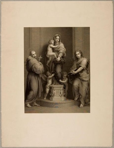 Editor: This is Antonio Perfetti's "Presentazione al Tempio" from the Harvard Art Museums. It feels very formal and staged. What cultural context can you provide? Curator: Well, look at the historical context in which this was created. Notice the idealized presentation. Who was this imagery designed to serve and what message was it conveying within its societal framework? Editor: So, it's less about pure artistic expression and more about societal messaging? Curator: Precisely! Considering the institutional backing and the religious narrative, it's a calculated visual statement. A very interesting observation! Editor: This discussion really shifted my perspective. Thanks! Curator: My pleasure! It's essential to consider the public role and socio-political influences on art like this.