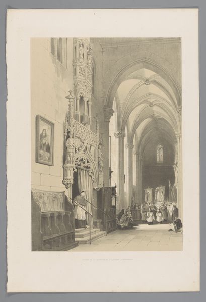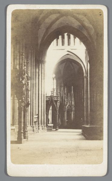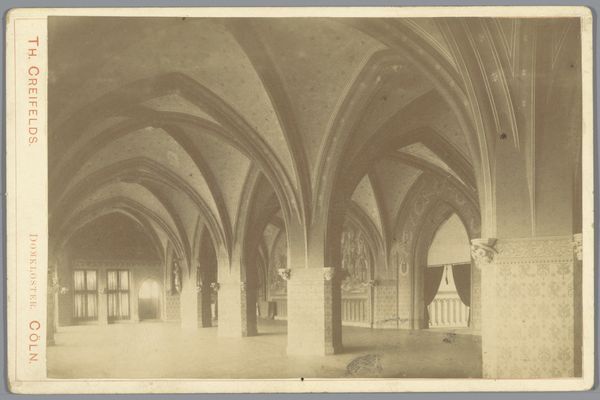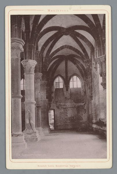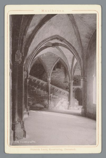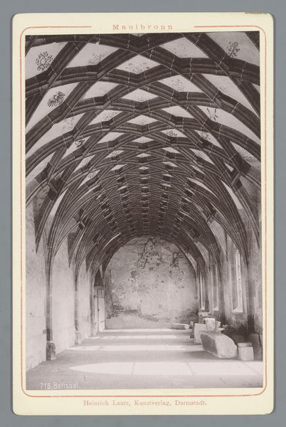 This photograph captures the Kloostergang in the Abbey of Maulbronn. Though we don't know who took it, the print was published by Heinrich Lautz, Kunstverlag, in Darmstadt. The photograph, rendered in shades of gray, emphasizes the architectural elements of the abbey, which appears to be made of stone, including vaulted ceilings, columns, and arched windows. You can imagine the builders carefully selecting and cutting the stone blocks, a labor-intensive process. They would have used chisels, hammers, and other hand tools to shape each stone, before assembling them according to structural design principles. The rough texture and visible joints of the stonework contrast with the smooth surfaces of the windows, which suggests a different set of skills and tools. This image allows us to think about the complex division of labor involved in the Abbey's construction, and how each trade contributed to the overall design. By recognizing these different forms of making, we can appreciate the full meaning of this impressive historical structure.