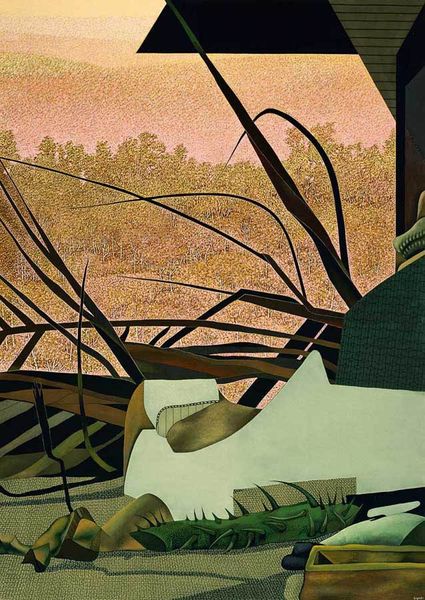 Will Barnet made this print, Summer Idyll, with flat colours, and hard edges. It’s interesting how he gets that kind of woodblock effect without the woodblock, right? I love how he uses the colour palette here to create a quiet, thoughtful scene. The painting is very flat, but he uses the colour to create a sense of depth and shadow. Notice how the dark greens of the trees in the foreground contrast with the lighter colours of the background, and that blue hint of sea. Then there’s the figure in the hammock, so still and relaxed, framed by the geometry of the hammock and the vertical trunks of the trees. Barnet has a real interest in depicting the everyday moments of life, and I’m thinking of other artists like Fairfield Porter, who found profundity in domesticity. There's an invitation here to just slow down, and be still for a moment. What does it mean to see things differently?
