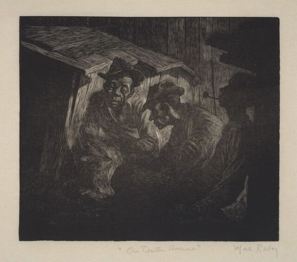 Irwin D. Hoffman made this etching, titled "Butts," in 1931. The cross-hatched lines, like a swarm of bees, build the darks and lights. It’s a study in black and white, but Hoffman coaxes a whole world of grays out of it. Look how the lines thicken and tangle to describe the figures' clothes. And then, see how they thin out, almost vibrating, in the space between the two men. You can almost feel the smoke and the warm glow of their shared cigarette. It’s a powerful contrast, like a spotlight shining on a fleeting moment of connection. There's something about the rawness of the etching, the way the lines are scratched into the plate, that makes the scene feel immediate and alive. It reminds me of Kathe Kollwitz, another artist who knew how to use black and white to tell stories about real people and everyday life. In the end, it’s not just about butts, it’s about what happens between people, the small gestures that make up a life.