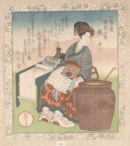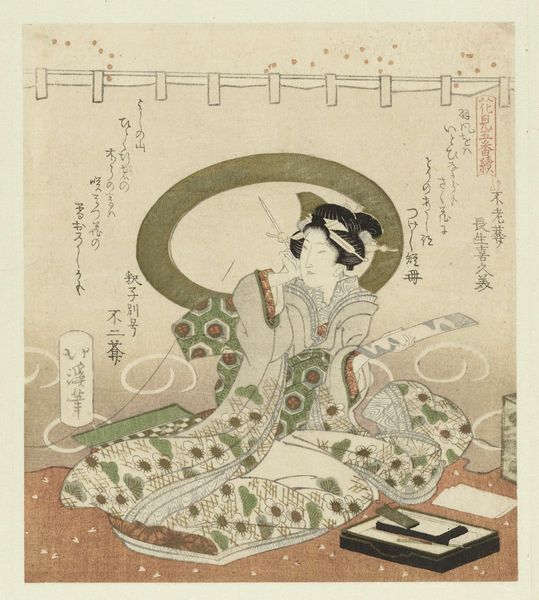 This woodblock print, "Woman with Shamisen," was created by Totoya Hokkei in Japan. The central figure, draped in a patterned kimono, kneels with her shamisen, a three-stringed instrument, embodying the elegant arts of the Edo period. Observe the cranes adorning her kimono, symbols of longevity and good fortune, which are deeply embedded in Japanese culture and echo through the ages in various art forms. These motifs are not merely decorative, they are powerful visual cues laden with cultural significance. Similar symbols appear across continents and centuries, from ancient Greek pottery to Renaissance tapestries. In each context, these symbols reflect the timeless human quest for meaning and connection. This interplay reveals how deeply rooted symbols evoke a sense of continuity and emotional resonance. Like echoes in a vast chamber, these artistic elements resonate with our collective memory, engaging us on a profound level. The recurring visual language of cranes takes on new meanings, yet always returns to its origin, a testament to its enduring power.