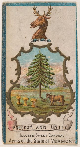 Curator: Allen & Ginter's "Maine, from Flags of the States and Territories" presents us with a fascinating example of late 19th-century commercial art, dating back to 1888. Editor: My initial reaction is how incredibly detailed and picturesque this small print is, almost like a miniature landscape painting. Curator: Indeed, it's intricate. We see the state flag prominently displayed, flanked by figures representing labor, above a scene of logging and transport. The visual rhetoric seems to uphold particular idealized visions. Consider the working class and landscape as promoted and consumed through a brand like cigarettes, for instance. Editor: Visually, the composition relies on distinct layers – the flag with its figures, the landscape below, and the ornate banner at the bottom. There is a very clear hierarchy established through this layered technique. Semiotically, what meaning does that structure communicate, intentionally or unintentionally? Curator: Well, we must remember the context in which this was produced. Flags during this era often served as symbols of burgeoning national identity and industrial progress, especially for consumption. Representations of labor were common, though idealized and often obscuring realities of class and race during Reconstruction. Editor: I notice the deliberate choices of color and their intensity in this image. The sharp blues of the flag contrast heavily against the paler yellows and oranges on the lower portion. What significance could be assigned to these decisions in rendering the overall design? Curator: The colors certainly draw attention and enhance the scene's legibility, but it is important to note how the choice of presenting idealized white workers obscures the crucial labor often performed by marginalized communities, specifically Native American and African-American people. The narrative simplifies the socio-political landscape, effectively sanitizing it for the consuming public. Editor: These tensions highlight the way aesthetics become entangled with much larger economic and political agendas. Curator: Exactly. A seemingly innocent decorative object like this tobacco card unveils the complex web of ideology, power, and representation. Editor: Viewing this print now certainly reminds me how imperative it is to deconstruct images with a critical and discerning perspective. Curator: Precisely, interrogating those representations allows for greater understanding of art's role in shaping perception.