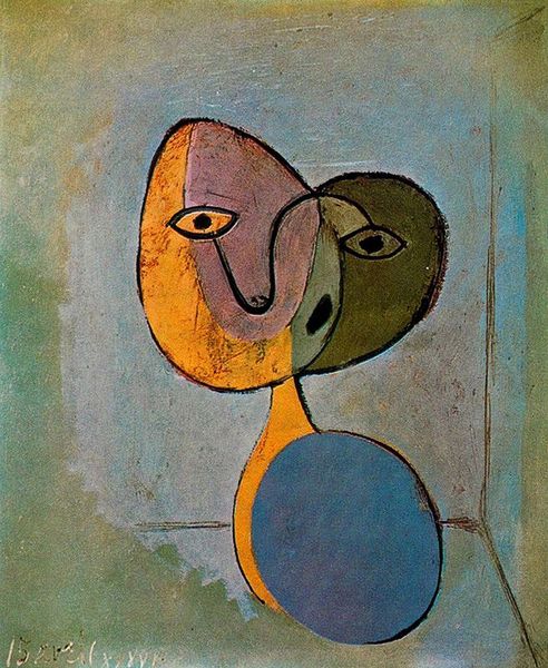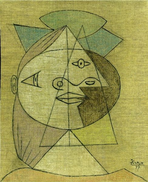 Editor: Here we have Picasso's "Woman with Hat (Olga)," painted in 1935 using oil paint. It's such a striking image. The way he deconstructs the face into geometric shapes… It feels almost confrontational, a distorted mask of femininity. What do you see in this piece? Curator: I see a fractured portrait, a representation that goes beyond mere physical likeness and delves into the complex power dynamics of Picasso’s relationships. This was painted during a turbulent period in his marriage to Olga Khokhlova. Understanding this context, we can see the portrait as a critique, even an unmasking, of societal expectations imposed on women. The distorted features—the sharp angles, the unsettling colors—what do these choices communicate, particularly when we consider prevailing beauty standards? Editor: So, the distortions aren’t just aesthetic; they're loaded with social commentary? I hadn't thought of it that way. Curator: Exactly. Think about Cubism as a movement; it aimed to break down traditional modes of perception. In this case, it reflects the breaking down of a relationship, and the imposed image of what it means to be a "woman". What feelings do those unsettling colors evoke for you? Do they amplify a sense of unease? Editor: Yes, definitely. The jarring green and the almost ghostly white... It does create a sense of unease and disharmony. It feels like a commentary on a strained relationship, definitely changing my perception. Curator: Precisely! By understanding the historical and social context, along with the artist's personal life, we can unearth a deeper understanding of the artwork. Editor: I learned to consider both formal artistic elements alongside cultural context to find art's activist agenda. Curator: Likewise, recognizing art as a reflection of society urges us to question it with ever new views and diverse backgrounds.