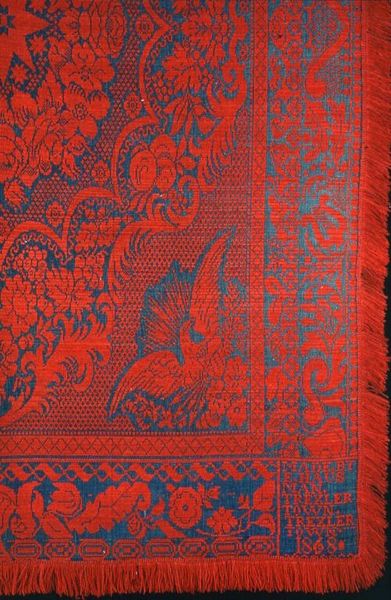 This coverlet was woven in 1854 by Ira Hadsell in Palmyra, New York. Dominating the composition is the American eagle, clutching arrows and an olive branch, a symbol adopted from ancient Rome, representing war and peace. This emblem, along with the motto "E Pluribus Unum," asserts the burgeoning identity of the American nation. The image of Liberty, encircled with stars, echoes classical representations of female allegories, a motif traceable back to ancient Greece. We see its reincarnation in French revolutionary imagery, embodying ideals of freedom. Note how the eagle itself, derived from Roman imperial iconography, undergoes a metamorphosis, mirroring the transformations of power and ideology across continents and eras. The coverlet doesn't merely depict symbols; it weaves them into a complex pattern of collective memory, revealing how images migrate, adapt, and are imbued with new meaning, engaging us on a subconscious level.