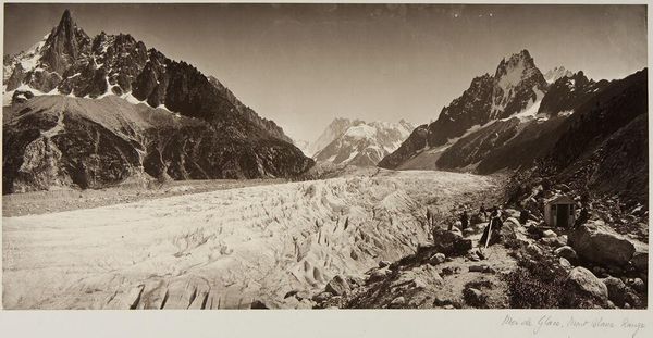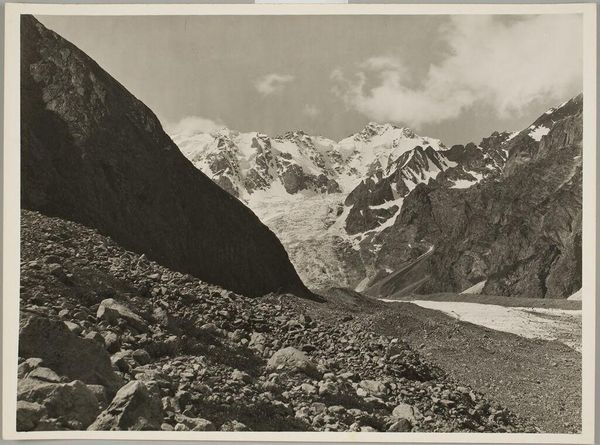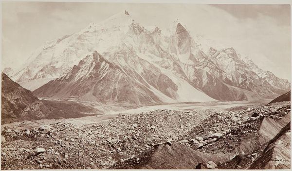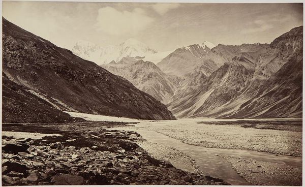 Editor: This striking albumen print, "Kulu, Spiti; View from the Kunzam Pass, 14,931'," was captured by Samuel Bourne. The stark, rugged landscape evokes a feeling of isolation. What’s your take on this piece? Curator: Bourne's work isn't merely documentation; it's deeply implicated in the colonial gaze. These romanticized landscapes encouraged British settlement and resource extraction, erasing indigenous perspectives. How does knowing this shift your understanding? Editor: That’s a good point, I hadn’t considered that. It definitely complicates the way I see it. Curator: Exactly. It prompts us to question whose stories are being told and whose are being silenced in these seemingly objective representations of the natural world. Editor: So, it's not just a pretty picture, but a tool of power. Thanks, that gives me a lot to think about. Curator: Indeed, art always operates within a complex web of social and political forces. Always dig deeper!