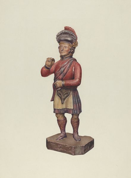 Walter Hochstrasser made this drawing, Cigar Store Figure, on paper, but we don't know exactly when. It is quite a formal drawing, almost academic, but somehow it's still very strange. Look closely at the way he's rendered the form, how the light catches the curves and folds of the figure’s clothing. The colors are so saturated, it almost feels like the figure is lit from within, like a cartoon, or something from the hand-painted billboards of the early twentieth century. I particularly like the way that the figure has an odd kind of sheen, it's almost like the artist is showing off all the rendering techniques that he knows, but in an awkward and uncanny way. It reminds me of some of Alex Katz’s paintings from the 1960's, in the way that the figure seems to exist in an ambiguous relationship with its background. Ultimately the image is less about the thing itself and more about the act of painting.