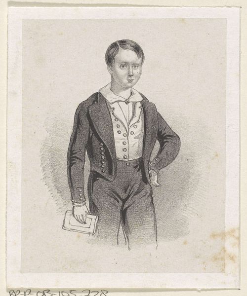 Curator: This print, dating from about 1835-1840, is titled "Costume de bal d'humann." The artist is currently unknown. It's held here at the Rijksmuseum and rendered through engraving. Editor: My initial impression is that there’s a fragility to this image. The fine lines, the man’s pose – he seems both self-assured and vulnerable. Curator: The "Costume de bal" translates to "Ball Costume." Consider the era. What do you suppose a man’s formal dress communicates about the shifting landscapes of 19th century masculinity, gender and class? Editor: Visually, it speaks to the language of tailoring—the tight breeches, the emphasis on the waist and chest. This aesthetic harks back to earlier eras while suggesting evolving symbols. This portrait makes me consider fashion's dialogue. The dress could tell an elaborate story about gender, performance, and status. Curator: Absolutely, dress in that epoch was deeply entwined with societal codes and visual messages. It represented entrance into privileged spaces while broadcasting your status to everyone else. Editor: And there's a real performative aspect as well. Think about the exaggerated posture and meticulous details; his bearing speaks volumes. Even though his coat signifies power and confidence, there's also that ruffled cravat – quite delicate. Is this then also communicating more subtle details beyond power and position? Curator: Precisely. The cravat whispers of a changing ideal, an emerging romantic sensitivity perhaps. But in the broader view, who gets to have a “sensitive” side and who has access to such elite balls in the first place? This piece begs us to see it as part of a greater socioeconomic landscape. Editor: These are indeed questions we should all keep in mind. Looking closer, I really see more of that era. The print isn’t just a portrait but an icon of aspiration. Curator: True—viewing it from today can provide invaluable insights when we interrogate what’s communicated between representation, society, and identity.