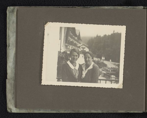 Curator: Here we have a photograph titled "Eugen Wachenheimer and an unknown woman on the balcony of a hotel, August 1932, Eibsee (Bavaria)," placing our subjects squarely within a specific time and location. What's your initial take on it? Editor: My first impression is one of subdued elegance. The grayscale tones evoke a sense of formality, yet the setting seems rather peaceful. The composition leads my eye towards the couple but is balanced by the hotel facade and landscape backdrop. Curator: Indeed. Given that this photo originates from the Wachenheimer family collection, its materiality is rather interesting. It speaks to middle-class aspirations and leisure travel becoming increasingly accessible, evidenced by their choice of location. The means of production - photography and tourism - intertwine here. Editor: From a purely formal perspective, note how the crisp white of the hotel contrasts against the subdued grays of their clothing and the mountainous backdrop. This division of space and value is beautifully realized. Curator: Right, the visual harmony achieved within the chosen medium hints at a deliberate construction of a personal narrative for the Wachenheimer family. Their pose and clothing certainly weren’t accidental or improvised! Editor: Yes. And the details in the landscape—those blurred trees receding into the background—are very skillfully rendered for an amateur photograph of the era. It elevates the work, transcending mere documentation. The image teeters elegantly on the boundary between formal portrait and relaxed memento. Curator: That division reveals something interesting about consumerism and image construction back in 1932. Tourism required the ability to craft new identities in unfamiliar environments; photographs helped solidify the authenticity and meaning of the experience. Editor: So, beyond just a photograph of a man and a woman in 1932, this also functions as an encapsulation of their social status and the material culture they embraced. Fascinating! Curator: Precisely. It also acts as evidence. These materials and places point towards something far beyond just their mere photographic depiction. Editor: I agree, a deep dive into their visual narrative reveals a richer and wider story than the mere photographic scene initially lets on. Thank you for sharing the details of production on this.