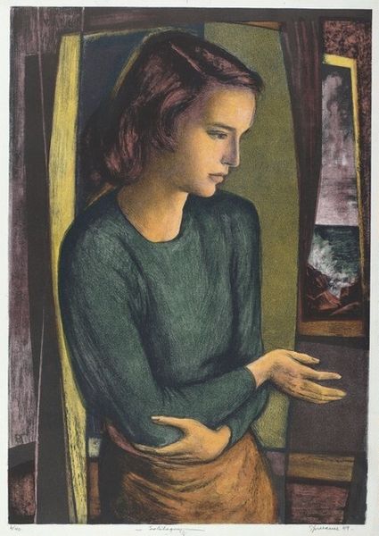 Editor: Looking at "Santina," an oil painting by Felice Casorati, I'm immediately struck by the figure's almost haunting stillness. It’s a portrait, but her gaze doesn’t quite connect, and the muted colors lend it a somber air. What can you tell me about the context of this work? Curator: It’s fascinating how Casorati evokes such a reserved yet powerful presence, isn't it? Considering the social and cultural atmosphere in Italy during the early 20th century, what might this restrained depiction of a young woman be communicating? Think about the evolving role of women at the time, and the dominant political climate. Editor: I suppose a figure that resists idealization could be read as a quiet form of rebellion? A refusal to participate in established norms, maybe? Curator: Exactly! And notice the geometric forms underpinning the composition. How does that rigidity contribute to the overall feeling? Editor: The geometric shapes create a sense of formality, almost like an oppressive structure holding the figure in place. Curator: Indeed. Casorati was engaging with modernism while referencing Renaissance artistic traditions. How might the dialogue between these styles play into the painting’s reception? Editor: It gives it a timeless quality but also suggests a break from the past, a tension between tradition and modernity that mirrors the societal shifts happening then. Seeing that clash really opens up my eyes to this painting's historical message. Curator: And that tension, ultimately, makes this more than just a portrait; it’s a subtle commentary on a society in transition. Hopefully that contextual background enhances your understanding of the imagery.