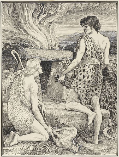 Editor: This is William Blake’s "The Temptation and Fall of Eve," created in 1808 using pen and watercolor. There’s something so raw about the figures, an almost discomforting tension within the composition. What compositional elements stand out to you? Curator: The linearity is quite pronounced. Notice the stark, almost graphic quality of the figures and landscape elements. The bold outlines, typical of Blake, define form and create a sense of separation between the figures and their surroundings, intensifying the drama of the narrative. Editor: The stark contrast certainly emphasizes the separateness of Adam and Eve at the moment of temptation. The serpentine form coiled around Eve and presented toward her mouth–does its placement dictate a particular reading? Curator: Precisely. Consider the symmetry, or lack thereof. Adam's pose, reactive, contrasted with Eve's engaged passivity and acceptance, offers two possible interpretations. Note the visual weight, too, that the serpentine body gives Eve, in terms of visual balance. The image, though symmetrical, holds unbalanced weights within the central figures. Is this compositional division intended? Editor: That's a fantastic observation. I hadn't considered how the compositional imbalance might reflect the moral imbalance introduced at this moment. The visual separation you described enhances the psychological effect so brilliantly. Curator: And that's the power of formal analysis, to reveal thematic depth solely through careful consideration of form and composition. Editor: Right. It has shifted my entire perspective on how effectively formal choices can enhance the thematic implications of an image. Curator: Indeed, we both stand to appreciate William Blake's unique talent in manipulating these stylistic decisions to tell an enduring and thought-provoking story.