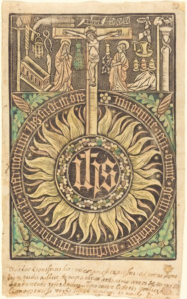 Curator: This is "The Cross," a print made with watercolor around 1500 by an anonymous artist. Editor: It’s visually quite striking, the redness against the dark background gives it a powerful, almost stark quality. And it’s very graphic. I wonder what function it had? Curator: Given the medieval context, it most likely served a devotional purpose. Images like this, readily reproducible, would have aided individual worship, circulating not only sacred narratives, but theological symbols—the Cross itself being the central one here. Consider the floral flourishes. How do you interpret their placement and form? Editor: Well, their integration softens the visual impact of the stark red cross, infusing it with an earthly elegance that counteracts its rather blunt form. The interplay between severe geometry and organic forms is definitely intriguing from a formal perspective. It brings up a question. Would people use these during times of upheaval? As objects of devotion in private spaces or at sites of worship during times of war or religious conflict? Curator: Precisely! Medieval Europe experienced countless periods of social and religious instability. Visual aids such as prints provided easily accessible symbols that transcended language, and became invaluable in bolstering faith but also in forging common beliefs, solidifying identities. The prints thus became instruments in negotiating power. The artist clearly used linear forms to denote a complex set of historical issues, from a religious base to questions about the powers of dissemination. What does this form represent in relationship to those powers? Editor: Fascinating point. I had initially framed this piece according to its aesthetics, but you encourage thinking about its historical role, expanding on ways we could begin decoding how image distribution created a base for devotional, economic and military transactions during the Middle Ages. I’ll never view it in the same light. Curator: Understanding the symbology and distribution unveils additional ways of approaching and understanding the power this tiny art piece wields even to this day.