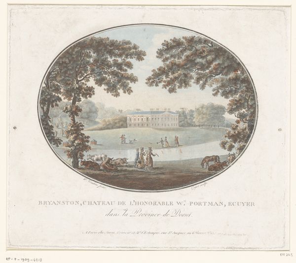 Laurent Guyot created this print of Ranston in Dorsetshire, sometime around the late 18th century. This delicate image offers us a glimpse into the idealized life of the English gentry. Guyot, a French artist, captures the serene facade of Ranston, a grand estate owned by the Ryves family. The estate is framed by the river, and the figures of the landowners are seen enjoying the grounds. But look closer. Who is missing from this picture? This landscape is not just about aesthetics; it speaks volumes about power, privilege, and the invisible labor upon which such estates were built and maintained. What stories might the unrepresented voices tell? Consider how this image, like many of its time, carefully constructs a narrative of leisure and dominance, subtly reinforcing the social hierarchies of the era. As you observe the idyllic scene, reflect on the complexities of history and representation.
