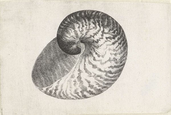 Curator: Let’s turn our attention to this engraving titled "Schelp, cassis cornuta" created sometime between 1644 and 1652 by Wenceslaus Hollar. Editor: Wow, even in this tiny black and white engraving, it feels weighty, doesn't it? There's this sense of the ocean’s depth just packed into this little shell. It’s like holding the entire sea in your hand… if the sea were grayscale, that is. Curator: Precisely. The artist’s rendering highlights not just the shell’s external structure, but the socio-economic contexts linked to these types of natural specimens in seventeenth-century Europe. These objects of natural wonder were very collected and displayed, sometimes forcefully extracted from their original inhabitants and ecosystems. How might Hollar's seemingly simple representation also embody a complex narrative of global exchange and colonial acquisition? Editor: That's heavy, for a shell! You know, I was just vibing with its texture— the meticulous lines mimic the rugged surface. It’s so tactile, I can almost feel the ridges and bumps, and imagine the slow crawl of some sea creature making its home inside… Maybe this connects to your point— thinking about what ‘home’ really means, who gets to have one, what gets left behind. Curator: Absolutely, considering this, it’s worth mentioning that “shells” are linked in various disciplines with sexuality and femininity—often intertwined within oppressive regimes that regulate gendered and racialized bodies. When viewing Hollar's artwork through this lens, one might question and unravel historical constructions imposed onto seemingly benign subjects, as these types of power dynamics shaped what stories were validated in Europe in the 17th Century, whose knowledge mattered, and, ultimately, whose realities and existences became marginalized and were actively erased. Editor: See, I learn something new every day. I was just seeing a shell, now I am seeing like… the universe in a seashell. Sort of humbling to think a little sketch could hold all that. Curator: Indeed, that’s the potent magic that lies within studying and contextualizing art; art gives way to seeing through multiple perspectives while understanding the narratives behind those views. Editor: Well, now I'm going to go find a seashell and have a good long think about all of this. Thanks!