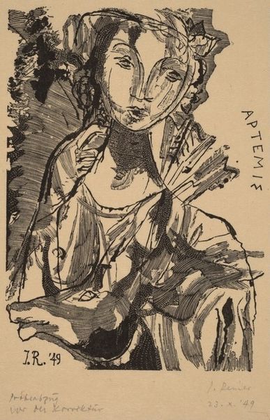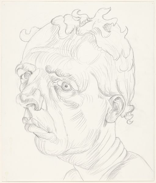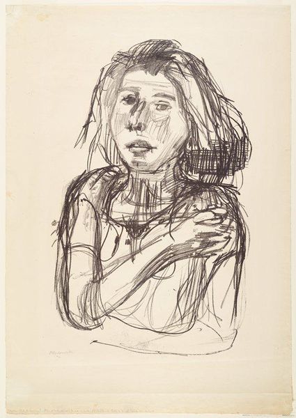 Curator: Looking at Oskar Kokoschka's "Corona I" from 1918, a somber mood seems to immediately wash over me. What’s your first reaction? Editor: The nervous energy in this portrait is palpable. The frantic strokes, the unsettling gaze. There’s very little smooth line work present; it's like raw emotion made visible. Curator: Absolutely. Kokoschka was deeply affected by World War I, having served and been severely wounded. This print was created near the end of that conflict, during a time of intense political and social upheaval across Europe. It’s hard not to see the anxieties of that era reflected. Editor: Notice the hatching, though. The density varies, creating this interesting play of light and shadow. It almost sculpts the form out of pure anxiety, wouldn’t you say? The way the hair is rendered, chaotic but somehow contained...fascinating! Curator: He captures a profound sense of psychological depth using such raw materials. His art became about confronting societal wounds. And in those jagged lines, you see that struggle and that effort in the lines of the face. There’s a sense of disillusionment that becomes almost universal during this time. Editor: But beyond the historical context, the drawing works brilliantly on a formal level. It challenges conventional portraiture by revealing a subject's internal state through purely visual means. Curator: Yes, the formal properties certainly enhance Kokoschka's vision, a reflection of a war-torn world, as filtered through Kokoschka’s subjective vision, the drawing offers a haunting glimpse into the psychology of a generation grappling with trauma and uncertainty. Editor: I’ll agree with that! Analyzing this print reminds me to look past conventional boundaries to uncover true form. Curator: And it demonstrates how social context deeply intertwines with the reception and understanding of art. It provides unique lenses through which viewers might engage more fully with such works in galleries and museums.