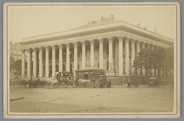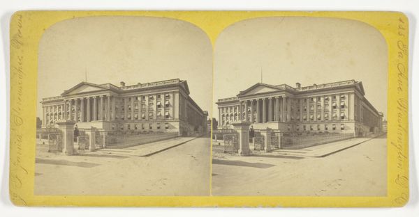 Editor: This is an albumen print, a stereoscopic photograph of the Hungarian National Museum in Budapest, taken around 1868 by Charles Gaudin. The building itself is quite striking, evoking a sense of neoclassical grandeur. What aspects of its historical and social context particularly resonate with you? Curator: Well, seeing this photograph, I immediately think about the rise of national museums in the 19th century and how photography played a role in shaping national identity. This wasn't just a picture of a building; it was a carefully constructed image of Hungarian cultural authority during a period of intense political change. Think about who this image was made for, and what messages about nationhood it was designed to convey. What do you notice about its style and intended purpose as a stereo card? Editor: That makes me consider the stereoscopic aspect; its mass appeal in the late 19th century helped in disseminating architectural achievements. Does the building’s design embody the cultural values of its time, beyond just representing national pride? Curator: Absolutely! The neoclassical style itself— the columns, the symmetry— all these elements are drawing on a very specific visual language to project an image of stability, reason, and connection to a perceived glorious past. Considering this style, think of how its architectural message aligns with contemporaneous social changes and political goals. Editor: It's fascinating to consider how architectural choices and photographic techniques can so directly reflect a nation's aspirations and political narratives. It almost invites us to ponder, what visual narratives are our museums projecting today? Curator: Precisely. This photograph not only documents history; it actively participated in shaping it. We can gain so much when we start to see these photographs not as transparent records, but as carefully constructed cultural artifacts.