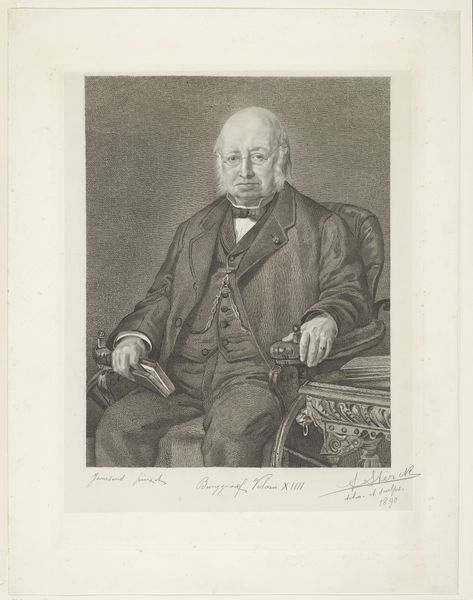 Editor: So, here we have Peter Gemzøe's "Major Johan Andreas Bruun Neergaard," a lithograph from somewhere between 1811 and 1875. It's a really striking portrait, very stately, and his gaze feels so direct. What strikes you when you look at this piece? Curator: What strikes me is the sitter’s posture. It conveys power, certainly, but also, perhaps, a degree of weariness. Considering this lithograph was created during a period of immense social and political upheaval, how might Neergaard’s image function within that context? Does he represent the established order, or could there be a more nuanced reading? Editor: That's a good point! I hadn't really thought about the potential conflict there. He seems very comfortable, almost entrenched. Could that comfort itself be a statement? Curator: Exactly. And let's consider the details: the carefully rendered clothing, the books on the table, the setting itself. These are all signifiers of status and intellect, but also tools for constructing an identity within a specific social hierarchy. How does the artist use realism to convey both the individual and his role within society? Editor: The realism definitely adds to that sense of immediacy, of encountering an actual person. It’s like he is actively choosing to be seen in this specific way. But then the print medium itself creates distance, doesn’t it? Curator: Indeed. The lithograph allows for wider distribution of his image. What impact did a readily available image of power have during that time? What discussions might it ignite, and amongst what audiences? Editor: I guess I was only considering the individual, but it makes total sense that his identity is deeply intertwined with the bigger picture. I never thought I would be able to analyze such an old piece and relate to modern sociology studies. Curator: These older artworks offer a tangible opportunity to ground abstract thoughts, thus they provide the best learning grounds to apply these analyses!