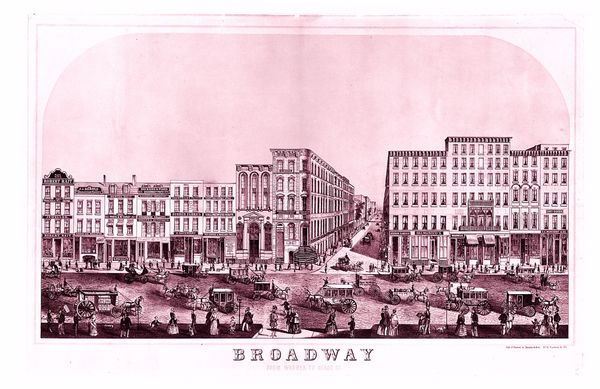 Editor: Right, so here we have "Broadway, New York: From the Western Union Telegraph Building Looking North," a lithograph by Currier and Ives from 1875. What strikes me most is the sheer energy; it's such a bustling scene! What do you see when you look at this piece? Curator: Ah, yes, it’s like stepping into a time capsule, isn’t it? Beyond the obvious spectacle of a vibrant, emergent metropolis, I find myself drawn to the quieter stories woven into the details. Can you imagine being one of those tiny figures, rushing along Broadway, propelled by the same dreams and anxieties we grapple with today? Do you see that hint of smoke in the distance? It almost smells like ambition, don’t you think? Editor: Absolutely, the details are fascinating! So, would you say it's a celebration of urban life, or is there a critique there too? Curator: A bit of both, perhaps? Currier and Ives were masters of capturing the popular imagination, of reflecting back what people wanted to see. It’s a grand, romantic vision, but that romanticism probably masks certain realities. There is the whole question of industrialisation, class differences, and what all that bustling really *cost*. Isn’t it a strange paradox, the beauty we find in something forged in sweat and steel? Editor: That's a great point. I hadn’t considered the social commentary aspect as much. So, seeing the art and history mixed into one print adds another layer to the experience, don't you agree? Curator: Definitely. The charm is, well, charming but it's equally fascinating when considered a visual document. A document of a changing era. Food for thought, for sure!