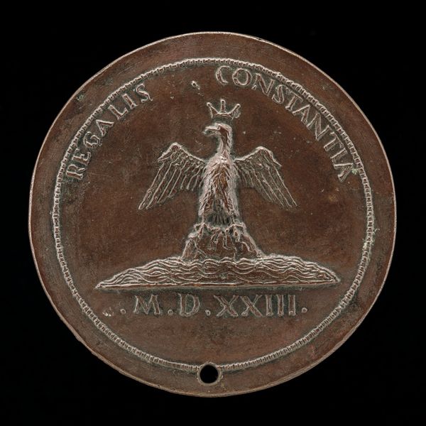 Curator: This object is a bronze medal known as "Inscription [reverse]," created around 1540 by Friedrich Hagenauer. Its dimensions are quite intimate, inviting close examination. Editor: Oh, instantly, it feels ancient. Like a whispered secret worn smooth by time and touch. A tarnished mirror to long-gone intentions. Curator: Indeed. Notice the circular composition; it emphasizes the cyclical nature of the inscription, drawing the eye from one line to the next, reinforcing the linguistic structure and impact. Editor: The font feels like each letter was wrestled out of the metal. Raw, unpolished… but, strangely elegant, as if carved by someone with a blacksmith’s hands and a poet’s heart. The light catches on some lines more than others, deepening shadows which makes it seem to heave forward with age. Curator: The material itself, bronze, imbues the work with significance. Bronze was commonly used to signify permanence, strength, and a link to classical antiquity. Editor: Thinking about it as 'sculpture', though... a flat, pocket-sized sculpture. Meant to be held, contemplated. Almost talismanic. I wonder what this little amulet whispers of, with its Latin phrases that may elude me now, but maybe the aura transcends such concrete meaning? Curator: Semiotics plays a role. The Latin inscription—though perhaps obfuscated today—would have conveyed a clear message to its contemporary audience. Its formal presence alone signals knowledge, power, and perhaps a hidden agenda accessible only to a select few. Editor: True... maybe the message is less for our specific, decipherable understanding and more about its timeless impact. That somebody held this, valued this, and wanted this specific statement—whatever it may actually be!—near. It hints at what humanity found important, almost half a millennium back. Curator: A keen observation. And what else? The surface shows what could be imperfections, or a character of use and time. It adds texture, enriching the dialogue between medium and concept, where each mark represents material and temporal engagement. Editor: To think all of those interactions it had—with fingers and pockets, conversations, sunlight, and shadowed corners—are still, somewhat, present, embedded in the object! Makes me want to pick it up. Look at its reflections in my own palms. To complete, even centuries on, that tactile equation between artwork and holder... Curator: Exactly! By acknowledging that "Inscription [reverse]" as a locus of interwoven ideas—historical, artistic, material—we begin to appreciate the medal as much more than just a simple surface decoration. Editor: I think you have given me a deeper appreciation. It isn’t just bronze with some etched words. The medal transforms into something that is far more deeply evocative. A meditation piece… for anyone fortunate enough to spend a minute to appreciate what they behold.