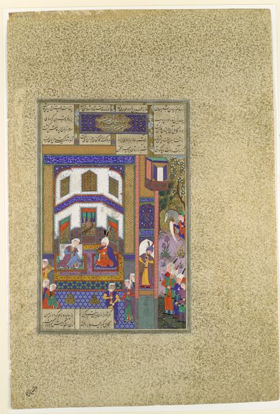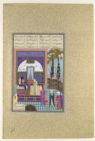 This is "Rudaba's Maids Return to the Palace", from the Shahnama made by Abu'l Qasim Firdausi. The painting strikes us with its ornate detail and vibrant color set against the neutral ground of the page. The geometric structure of the palace dominates the composition, its architecture rendered with careful precision. The artist uses a complex interplay of lines and patterns that serve not just as decoration but as a way of organizing the visual space. There is a tension between the flattened perspective typical of Persian miniatures and the attempt to create depth through layering of architectural elements. This pushes against traditional notions of space. The colors, predominantly reds, blues, and greens, are not used naturalistically, but rather for their symbolic value and decorative effect. How do these choices challenge fixed meanings of space? The use of text as part of the overall design is also notable, blurring the lines between word and image. Consider how the artwork redefines the viewer's perception of the narrative unfolding within.