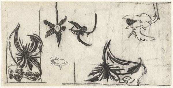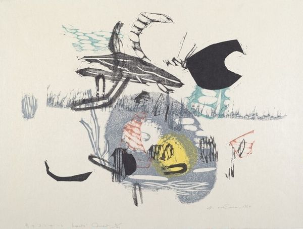 Curator: Here we have Ansei Uchima’s 1959 lithograph entitled "Song of the Earth," featuring an array of striking abstract and geometric shapes. Editor: Well, that’s quite evocative. I’m immediately drawn to the interplay of the dark, almost skeletal branches against the softer, textured background. It feels primal, like witnessing nature's resilience. Curator: Uchima was deeply influenced by the Abstract Expressionist movement. Examining his oeuvre, we can trace the influence of his early years spent training in arts in an academic and conservative setting. Editor: That contextual framework provides helpful insight to decode the cultural baggage behind it. It feels Japanese, a quiet energy with complex lines carrying ancestral memory and spiritual connections to land. Does the title perhaps relate to that connection? Curator: Indeed. The imagery invokes universal themes of regeneration and decay that speaks to both American and Japanese art. Uchima was also interested in how his art may convey personal themes of migration to broader public audiences. Editor: The brown of the lithographic stone creates a muted backdrop that speaks to the humble materials in it, perhaps relating the drawing back to basic artistic principles: a direct song. Curator: I find your perspective truly revealing. In his body of work, Uchima's abstraction allowed him to represent something intrinsically Okinawan, rather than producing easily digestible landscapes. The formal complexity then relates to social factors. Editor: And doesn’t it resonate even now? The idea of nature's song, its capacity to both destroy and create, rendered in the language of stark lines and gentle shading…it speaks volumes to our current moment, its cycles of history. Curator: It certainly does offer much food for thought, doesn't it? Seeing how personal, historical, and the social dimensions may come together. Editor: Absolutely. It makes one ponder on the deeper symbolic resonance of land, how artists grapple with representing their homeland through images over time.