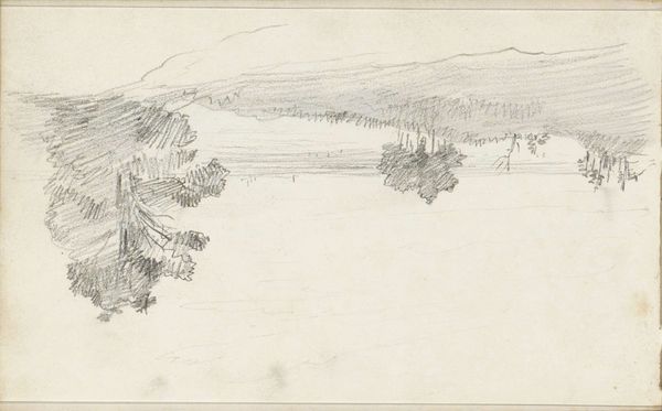 Editor: This is Benjamin Champney's "Lake Molly Chunk-a-Muuk with Tree." It's a small pencil drawing. I'm struck by the artist's delicate touch in capturing the stark trees against the subtle horizon. What do you see in its composition? Curator: The rhythmic interplay of lines—the angularity of the trees contrasted with the placid horizontal of the lake—structures a compelling visual dichotomy. Note also the spatial compression; how does this affect your perception of depth within the picture plane? Editor: It does flatten the space, emphasizing the surface. I hadn't considered that. Thanks! Curator: Indeed. Champney masterfully utilizes line to create a dynamic, yet tranquil scene.