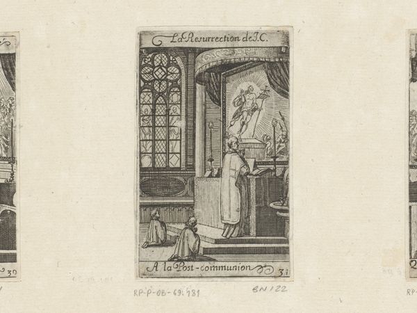 Curator: Sébastien Leclerc I created this engraving, "Priester met twee misdienaars voor een altaar," in 1661. It's currently held in the Rijksmuseum. Editor: It strikes me as an intimate glimpse into ritual. The fine lines create a subdued atmosphere, almost as if the scene is being revealed in hushed tones. Curator: The technique of engraving itself is crucial here. Think of the labor involved in creating these delicate lines, etching the metal plate to produce multiple impressions. It allowed for a wider dissemination of religious imagery and ideas beyond the elite. Editor: And those religious ideas are visually arresting. The altar seems to stage two realities simultaneously. We have the priest with his assistants, and behind them, what appears to be Christ crowned with thorns. It's an image laden with suffering, echoing across centuries. Curator: The social context matters too. Consider the role of the Catholic Church at the time and Leclerc's place within that structure. Was he commissioned, or was this work made with a different function or public in mind? These details reveal a network of patrons and markets that helped to promote particular theological visions. Editor: It seems very deliberate, as though Leclerc carefully constructed a series of signifiers for a particular audience. The positioning of the figures, the arrangement of liturgical items. Do you think he had an understanding that religious symbolism could offer comfort? Curator: Leclerc undoubtedly used visual language that had become standardised for religious prints. The distribution network that produced and consumed pieces like this were able to transmit the church’s dogma, both spiritual and, yes, often politically imbued too. The production value is key in creating lasting ideas, as much as religious ones. Editor: A convergence of faith, craft and visual storytelling, wouldn't you say? Curator: Precisely. Examining the conditions that allow these visualisations to be disseminated brings forth a history, as you show, enriched through symbolism.