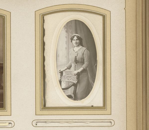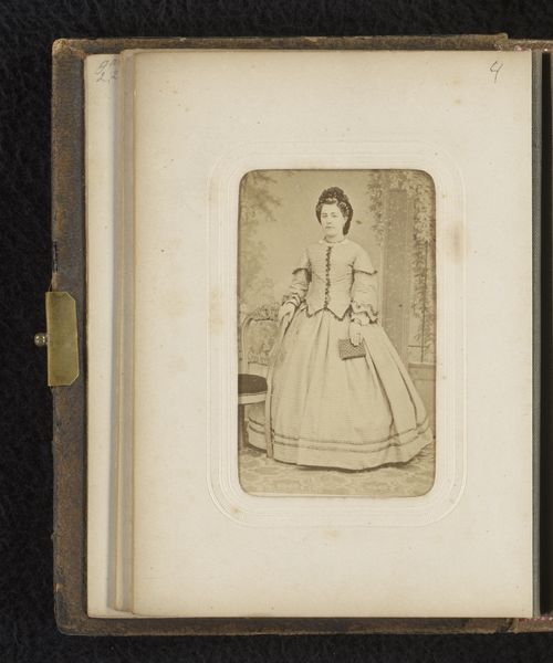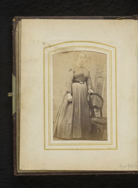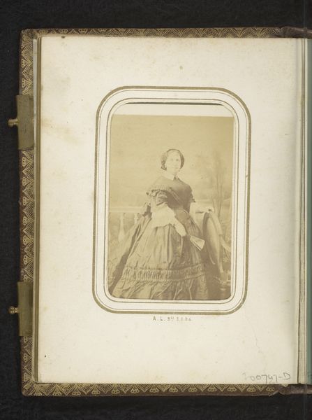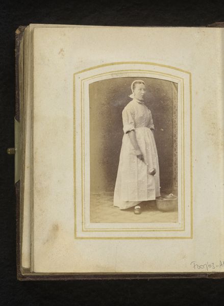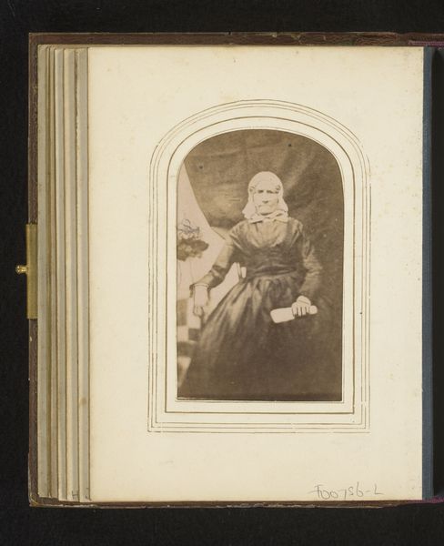 Curator: This photograph captures Carmen Paz between 1855 and 1865, and it's thought to be made by R. Castro. It's an albumen print, offering a remarkably detailed glimpse into that era. The image appears to come from a photo album of the period, given its framing and mounting style. Editor: It has such a somber quality, almost like a scene from a play. The controlled tones, and the somewhat stiff pose--it evokes a sense of formality, even sadness. Is that backdrop painted, or constructed, I wonder? Curator: It is likely a studio backdrop, a common practice at the time, to situate the sitter within a particular narrative. And, considering that the woman is wearing a nun's habit, her social role becomes immediately clear, inviting questions of devotion, faith, and perhaps societal expectations imposed on women. Her attire acts as a powerful signifier. What might she have sacrificed to wear that garb? What community sustained her? Editor: The albumen process would have demanded immense technical skill. I wonder about the preparation of the glass plate negative and the manipulation of light to achieve such soft gradations. And consider the labor involved, not just the photographer's but also the artisans crafting the frame and album – a collective production defining the aesthetic experience. It would not be a democratic craft. Only affluent groups could benefit. Curator: Precisely. And even Carmen Paz's access to this form of representation would be linked to her class and position. To pose for a portrait would have been considered luxurious. As we are trying to understand the subject of the piece we must acknowledge our inherent biases and access to viewing that artwork from our current place and time. The context in which this piece existed greatly shapes our perspective of its interpretation. Editor: That muted palette, almost monochrome. A world leached of colour seems fitting given the constraints – artistic, technical, social – that coalesce here. Even the presentation in the album emphasizes confinement and enclosure, like preserving a specimen or a relic. Curator: In this era photography began emerging as an expressive medium that also reflects identity and culture. In many respects, viewing these early photographic artifacts is like looking back on ourselves with recognition and an emotional tie. We can trace a continuity of experience with these images as documentation of their time, allowing their story to unfold over generations. Editor: Indeed. Pondering these very objects compels us to interrogate not only history's visual fabric but our role in deciphering that meaning in contemporary contexts. We each draw our interpretation through our own biases.