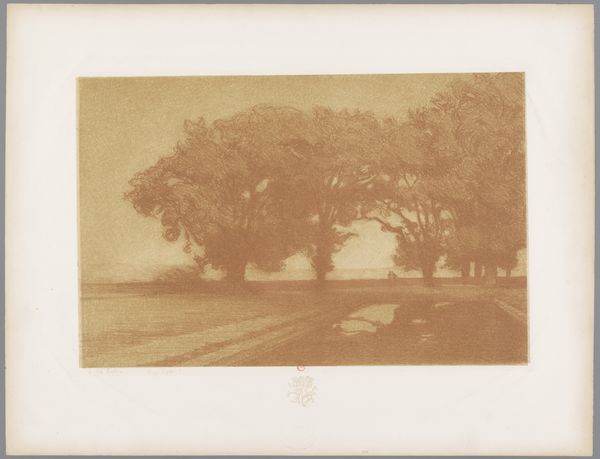 Curator: Charles-Marie Dulac’s “Park met bomen, vijver en terras,” or “Park with Trees, Pond, and Terrace,” an etching made between 1892 and 1893. It’s an interesting piece in Dulac’s oeuvre, blending cityscape and landscape elements through the print medium. What's your initial take on it? Editor: Hauntingly peaceful. It feels like a memory fading at the edges, doesn't it? All these muted tones... You almost hear the rustle of leaves even though it's completely still. It's melancholic but somehow comforting. Curator: The etching technique really lends itself to that feeling. Consider how the linear process allowed him to build depth, using the careful application of acid to incise the image. It democratized the process and produced more accessible work for middle class consumption. Editor: That’s fascinating. It makes me wonder about his choices of imagery, focusing on the bourgeois landscape... this park, a shared space, rendered with this solitary, dreamy atmosphere. Was it commentary, celebration, or pure observation? Did his etching choices change or influence these places in real life somehow? Curator: That's a valid thought. Looking at the print process itself, etching allowed for reproducibility. Prints circulated, influencing tastes and documenting contemporary social spaces. What does that say about consumption, materiality, and representation, if we have the landscape filtered through the material reality of the etching process? Editor: It definitely deepens my impression of it. Thinking of it as a captured moment for popular consumption adds this layer of intentionality. Like a manufactured nostalgia or an aspirational lifestyle packaged as art. Still, I come back to that feeling, that echo of serenity—a place for reflection maybe? It definitely is something between an idyllic location and also some sort of product. Curator: So it captures not only the location itself, but the consumerist intention of having it? Food for thought! Thank you, I hadn’t seen it quite like that. Editor: And thanks to you too. Thinking about it, these print processes add an undeniable dimension to the work. I think it's interesting to go beyond just the immediate beauty of this image to also understanding it's historical and social placement.