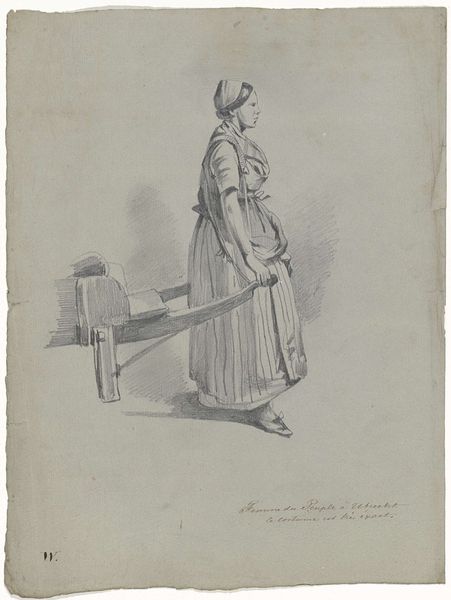 Pieter Christoffel Wonder created this drawing of a standing woman with a duster in her hands using graphite. The drawing presents a muted palette of grays and whites, focusing attention on the interplay of light and shadow that models the figure's form. Wonder’s emphasis is on capturing the textures and the play of light across the fabric. The woman, seen from the back, is rendered with delicate lines that define her simple garments and the contours of her body. The composition is structured around the vertical axis of her figure, balanced by the subtle diagonal of the wall shadow to her right. Wonder’s meticulous draftsmanship and attention to form align this work with the neoclassical ideals of his time. Consider how Wonder elevates a mundane domestic scene through careful observation and refined technique. He transforms a simple subject into an exploration of form, light, and texture, inviting us to find beauty in the everyday.