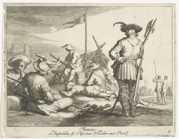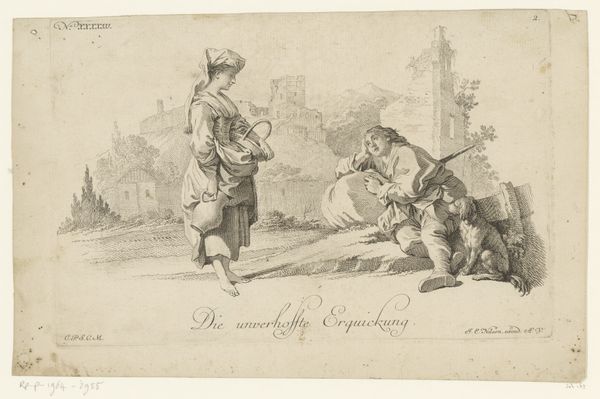 Editor: Here we have "Pleasures of Occupation," a 17th-century engraving by Cornelis Bloemaert, currently residing at the Met. It features two figures, one standing and one reclined, within a rather barren landscape. There's something quite melancholy about the scene, even though the title suggests pleasure. What do you make of it? Curator: Melancholy, yes, a fitting sentiment! Though, perhaps it’s not sadness exactly, but the gentle exhaustion of simply *being*. I always feel with these genre scenes of working folk, is a whisper about the small pockets of peace found amidst the toils of daily life. See how the standing figure pauses, almost statuesque, before those tiny birds taking flight? Is it pleasure, perhaps, in that transient observation? The world outside seems to hold its breath in that precise moment. Editor: I see what you mean. So it's not necessarily about grand, overt joys, but about these fleeting moments of respite and observation? Curator: Exactly! Bloemaert draws our attention to the quiet dignity in these everyday scenes. And note the line beneath the image: En vice curriculi blandus mihi fungitur Hylax, Blanditys minuens tædia Conga viæ... It suggests a substitute for movement, something sweet that alleviates the tedium of the long road. Is the dog their “Hylax”? Editor: That's beautifully put. I’d been focusing on the apparent bleakness, but you've shifted my perspective completely. Thank you! Curator: My pleasure! Art is so much richer when we wander in it, hand in hand. What felt, initially, as emptiness transforms to a silent conversation... perhaps the true occupation here isn't in labour but instead this reflective space between two strangers or sojourners of the world.