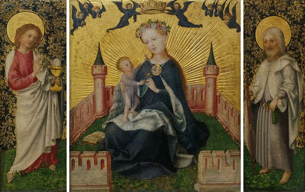 Curator: This small, intricate panel depicts the Coronation of the Virgin, dating from the 16th century and attributed to Nardon Penicaud. It’s currently housed here at the Minneapolis Institute of Art. Editor: It has a kind of otherworldly gleam to it, almost jewel-like. The colours, especially the blues and golds, are so intense despite its small size. It must be quite something to see it in person. Curator: Absolutely. This work showcases the mastery of enamel painting during that period in France. Think about the craftsmanship involved: the layers of enamel, the controlled firing, all contributing to its luminous effect. It's not just pigment; it's fused glass, an incredible transformation of raw materials. Editor: You know, seeing the Virgin being crowned always brings up questions of power and submission. Considering its historical moment, who exactly was commissioning art of this nature? What intersectional tensions were being expressed or, more likely, suppressed by these devotional pieces? Curator: That's precisely the kind of questioning we need. Royal patronage was obviously influential. Religious images weren't merely devotional objects; they served a very clear purpose in affirming and perpetuating a stratified social order. Mary becomes a vessel through whom social codes were being reified, in her femininity, motherhood, but also power. Editor: And notice the material wealth suggested. Beyond the raw skill and labour involved in producing enamel, it points to conspicuous consumption and access only available to a very privileged few. It becomes a document of both artistic ingenuity and stark economic disparity. The means of its production, after all, are deeply embedded within its visual narrative. Curator: I find it fascinating to contemplate the artist's position, too, nestled in the complicated context of artistic production within his own historical and political location. Did Penicaud, in crafting this piece, think about it as something beyond the sacred? Editor: I'm left pondering its resonance beyond the overtly religious symbolism. The artist manipulates materials, labor, and a religious subject. But more broadly it brings into sharp relief so much that existed behind its creation in its time. Curator: Yes, this opens up such rich ways of thinking about devotion, class, and craft! Editor: Absolutely, a small artwork prompting larger questions about making and meaning.