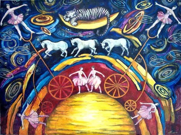 Małgorzata Serwatka created this watercolor entitled "Circus - sun III" sometime in the late 20th or early 21st century, though it is not dated. It shows the persistence of imagery associated with the circus in the collective imagination. Here, the circus is not presented as the historically-specific traveling show that emerged in post-Revolutionary France and spread across Europe and the Americas. Instead, this circus seems to be a theater of the mind that draws on cultural memories and childhood associations. We see traditional imagery, such as prancing horses, big cats, and acrobats, but they appear to float in the sky, as though liberated from earthly constraints. The figures and animals seem to be performing for an audience of planets and stars. As art historians, we are interested in the way such images as these take on new meanings across time. We use diverse sources, such as popular media, posters, and even literature, to better understand the changing social and institutional contexts of art.