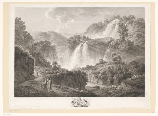 Constant Bourgeois created this print, "Zicht op een grot met waterval bij Balsthal," to capture a view of a cave with a waterfall near Balsthal. In the image, the sublime power of nature dwarfs the figures of two people who stand on a path. This work is part of a series entitled "Vues de Suisse." Bourgeois’s prints coincided with broader shifts in the understanding of landscape. The rise of Romanticism, with its emphasis on emotion, experience, and the awe-inspiring force of nature, invited new ways of seeing and representing the world. Bourgeois’s landscapes offer viewers an experience of nature that is both beautiful and imposing, reflecting the complex relationship between humanity and the natural world. The decision to depict Switzerland, celebrated for its dramatic vistas, speaks to the desire to capture a specific national identity deeply intertwined with its geography. This print invites us to reflect on the stories we tell about ourselves and the places we call home.