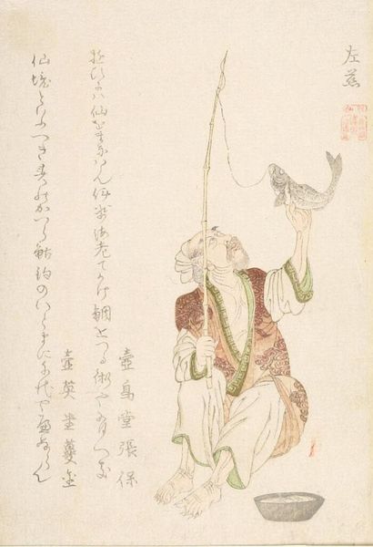 Curator: This print, attributed to Okumura Toshinobu, depicts Daikoku Cutting Plum Blossoms. Editor: It's such a lighthearted image, isn't it? The vertical composition really emphasizes Daikoku's precarious balancing act atop the rice bales. Curator: Indeed. Toshinobu uses strong, confident lines to define form, while the muted palette contributes to the print's overall sense of calm. Note how the woodblock technique renders the textures of the robes and the rough bark of the plum tree. Editor: And the plum blossoms, symbols of resilience and renewal, are especially poignant against the backdrop of Daikoku, the deity of wealth. There's a real sense of abundance and optimism here. Curator: The interplay between the static figure and the dynamic diagonal of the plum branch creates a subtle tension, wouldn't you say? Editor: Perhaps. What resonates for me is how Toshinobu encapsulates a whole narrative of prosperity and renewal in a single, elegant moment.