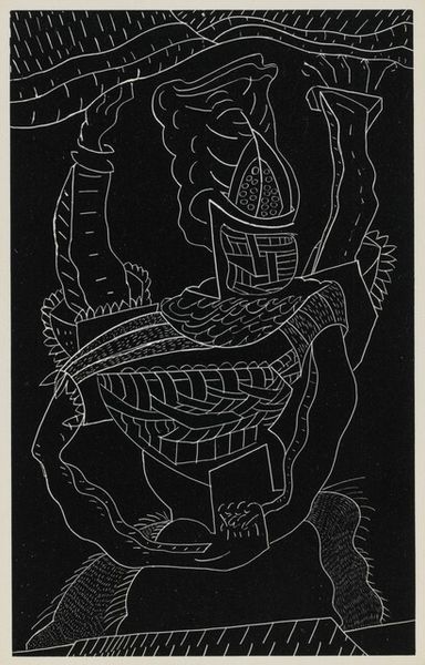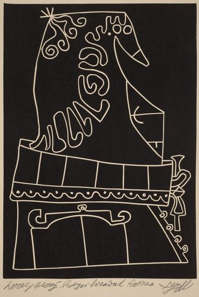 Carl Robert Holty made this print of a woman with a lyre sometime in the mid-twentieth century. The stark black and white is punctuated by these lyrical lines, which don’t quite describe the figure but evoke her. The image is built from these very economical gestures, as if Holty is trying to find the most simple, but also the most graceful way to capture her essence. Look at the lines that suggest her fingers and how they interact with the strings of the lyre. It's like a puzzle – a game to see how much information can be conveyed with so little. This work reminds me of other artists like Matisse who used line to describe form, or even Picasso in his cubist portraits, where a face becomes a series of planes and angles. But Holty, while working in a similar mode, adds his own voice to the conversation. It’s all about suggestion, and trusting the viewer to complete the picture.