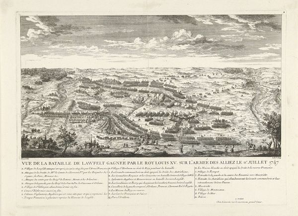 This print, depicting the Battle of Fontenoy in 1745, was made by Jean Baptiste Guélard, using etching – a process involving acid, metal, and a skilled hand. Look closely, and you'll see how the medium influences the image's appearance. The fine lines create a remarkable sense of depth, giving the battlefield a palpable presence. The etching process, which involves layering lines, allows for the creation of intricate details, from the ranks of soldiers to the contours of the landscape. This wasn't a quick, spontaneous sketch; it was a carefully planned and executed work. Consider the social context. Prints like these were often commissioned to commemorate significant events, serving as both historical records and tools of propaganda. The labor involved in creating such a detailed image would have been considerable, requiring both artistic skill and technical expertise. Ultimately, understanding the materials, processes, and context of this etching allows us to appreciate its full meaning, challenging traditional distinctions between art and craft.