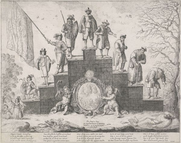 This print, "Afbeeldinghe der vyf siennen", was made by Reinier (I) & Josua Ottens and it allegorically depicts the five senses. The image creates meaning through visual codes, cultural references, and historical associations, typical of the Dutch Golden Age, when the Ottens were active. Consider the way it comments on the social structures of its time through its allegorical representation of sight, smell, hearing, taste, and touch. The print’s self-consciously conservative style reflects the values of a society that was becoming increasingly commercial but still had firm moral codes. The institutional history of art during this period is also relevant, with printmaking playing a significant role in disseminating knowledge. Understanding such art requires examining the cultural and institutional context in which it was produced. Research resources such as period texts, social histories, and museum archives can all offer insight into this work. The meaning of art is always contingent on its social and institutional context.