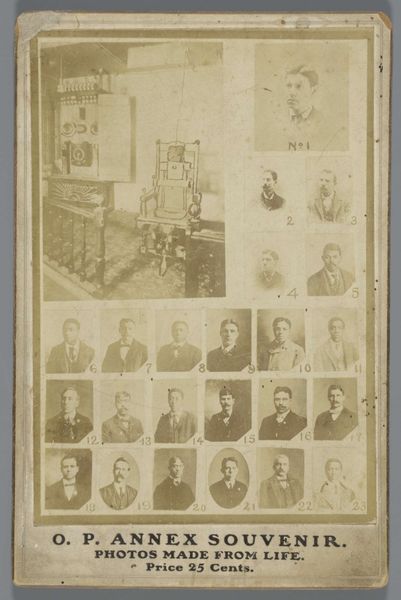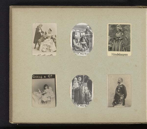 Editor: This is "The Madame B Album," created in 1870, now housed at the Art Institute of Chicago. It seems to be an arrangement of albumen prints, perhaps with colored pencil accents. The overall composition feels very formal, almost like a family tree… What can you tell me about this piece? Curator: What immediately strikes me is how this album reflects the performance of identity within 19th-century bourgeois French society. Consider the photographic medium itself—photography provided a 'modern' means for families to document themselves. Albums like this were carefully curated projects, shaping and cementing social standing through a carefully chosen collection of portraits, almost like social media of the time. Editor: That's fascinating! So it’s about image construction and social presentation? Curator: Precisely. The placement of each portrait, the inscription below them if there are any... they are all decisions made within the constraints of societal expectation and personal desires. We also have to acknowledge that photographic studios were businesses. They served the desires of a growing middle class keen on self-representation, a world captured in Proust's writings for instance. What effect do you think the framing of each smaller picture creates on the viewing of the whole work? Editor: The way the central picture becomes the focus of attention does create a focal point and, for me, highlights the way this page tells a particular narrative that Madame B wanted to construct for her family history. Curator: Precisely! Perhaps this arrangement suggests relationships or hierarchy; further research might reveal family connections and the intent behind those selections and careful arrangements. It prompts us to reflect on the broader implications of photographic representation during this era. Editor: It’s like a material embodiment of social aspiration! Thanks, I've never considered family photos this way. Curator: It’s been my pleasure! It really underlines the political undertones behind imagery and presentation, doesn't it?