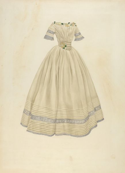 Francis Law Durand made this watercolour painting, Dress, sometime during his lifetime. It’s like a fashion plate, but there's something so odd and lovely about it. The simple vertical stripes of the dress are so exact, and the darker blue lines feel almost like a map. The whole thing has a beautiful handmade quality, you can see the paper’s texture coming through the paint. Look closely and you can see the individual strokes, how the colour pools in places, how the application of the paint changes the tone of the blue, making it darker or lighter. There’s this sense of the artist building up the image, stroke by stroke. There's something very Agnes Martin about this, or maybe it’s the other way round! It really shows how fashion, like art, can construct different ways of seeing and thinking about the world. It’s more than just a dress; it’s an idea.
