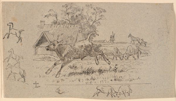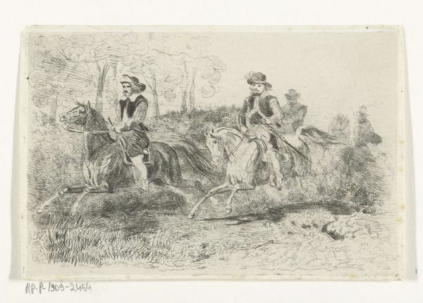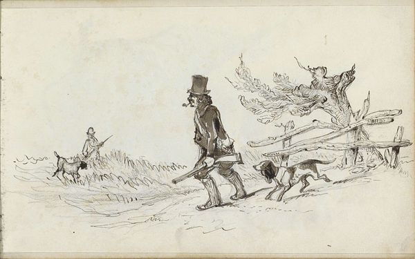 Francis Arthur Fraser made this drawing, ‘Hunting Scene: Horse and Thrown Rider,’ sometime between the mid-19th and early 20th century with pen and ink on paper. Fraser was known for his sporting and military subjects, often reproduced as illustrations in periodicals. Here, the controlled lines and varied cross-hatching of the pen create a detailed image, capturing a mishap during a fox hunt. Look closely, and you will see a rider who has clearly taken a tumble, much to the amusement of another rider. The artist’s skill is evident in the way he renders the textures of the horses' coats, the riders' attire, and the surrounding landscape. Fraser's choice of pen and ink is significant; it allowed for mass production and distribution of his images in books and magazines, and the rise of the illustrated press created a demand for artists like Fraser, who could capture scenes of contemporary life with accuracy and flair. This drawing, therefore, is not just a depiction of a hunting scene, but also a product of the Victorian era's burgeoning print culture. It is a reminder of the close relationship between art, industry, and social life.
