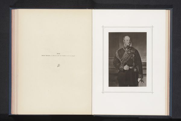 Editor: This is "Portrait of Wilhelm I at the Age of 79," potentially from 1876, by Werner Braun, and it's a photographic print. What immediately strikes me is how formal and almost staged the whole scene looks. What can you tell me about this image? Curator: Look at the posture: Wilhelm is seated, but upright, presenting himself for posterity. Portraits such as these are powerful symbols. The chair itself is a throne, representing stability. Note how he holds himself; can you see the weight of history, tradition, and the expectations of leadership he embodies? Editor: I suppose so, the beard and the clothes all indicate that authority figure, don't they? How did these things convey authority at the time? Curator: Indeed, consider the context. Wilhelm I was the Emperor of Germany during a time of immense social and political upheaval. The trappings of royalty - the beard, the clothes, all functioned to create an image of power at a moment of immense change. His face communicates resolution. What do you imagine it communicated to his people? Editor: That's really interesting to think about. Perhaps a message of stability, or tradition amidst all that change. I will be on the lookout for all these things from now on. Curator: Precisely. It is in how images act as cultural touchstones over time where meaning lies. Editor: Thank you, that’s given me a whole new perspective.