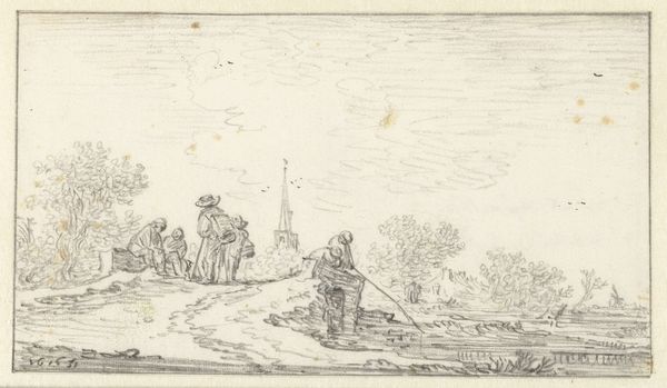 Curator: Ah, look at this! This drawing, "Two Sketches of Figures on the Dunes near Scheveningen," possibly dating from 1660 to 1666, is by Jan de Bisschop, here at the Rijksmuseum. It’s a charmingly understated piece, rendered in pencil and ink on paper. Editor: My immediate reaction is one of profound melancholy. The tonal paper lends a sepia wash, a feeling of something receding into time, like a fading memory of laborers going about their day. Curator: You know, I often wonder about those figures. Are they simply observed, or is de Bisschop embedding something of his own narrative here? Given the period, there’s a lot of societal commentary one could weave in. Editor: Precisely. Look at the way they're positioned in the landscape—almost swallowed by it. The prominence of the dunes raises questions of social hierarchy. Who owns the land? Who toils upon it? What are the power dynamics at play? Curator: That’s a valid reading, certainly. But there’s a certain… tenderness, too, don't you think? A softness in the rendering, a human connection between the artist and his subject. These aren’t posed portraits, they are genuine glimpses into the lives of people. Editor: A tenderness perhaps, but a qualified one. The swiftness of the sketch—note the 'light pencil work'—implies transience. Lives lived, perhaps, only to be swept away by the next tide, or perhaps simply neglected and abused by landowners. The casualness of the technique belies the precarity of existence of working classes. Curator: Hmm, yes. There’s an undeniable sense of life's impermanence, certainly. But also a feeling that, for de Bisschop, observing and capturing it held significance in and of itself. The drawing as a kind of preservation. Editor: I agree that it's significant. It’s a valuable record, revealing a snapshot of life in the Dutch Golden Age. It serves as a reminder that we can gain insights even from the simplest of sketches about the complexities of human relationships, social conditions, and historical forces that are continuously shaping individual lives. Curator: Yes, precisely. A brief, perhaps fleeting, encounter that opens into a wide world of interpretation and introspection. Editor: An understated and, indeed, affecting artwork for which I am all the more grateful after our little exchange.
