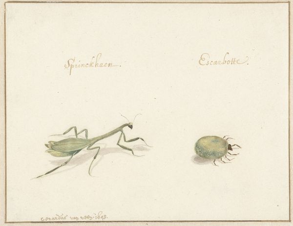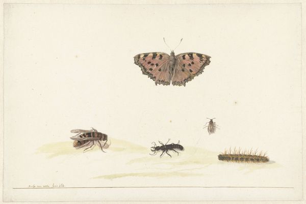 Editor: Here we have "Two Insects" by Rochus van Veen, dating back to 1674. It’s an ink drawing on paper, and there's a kind of stillness to it despite the subject matter. They feel like specimens carefully observed. What do you see in this piece? Curator: Well, these insects, rendered with such precision, speak volumes about the burgeoning scientific interest during the Baroque period. But consider also the symbolic weight often assigned to insects – from representing fragility and ephemerality to the darker associations of disease or decay. Editor: I hadn’t thought about those symbolic connections. It's interesting, this detailed rendering could be scientific, yet these associations add a whole new layer of meaning. Curator: Exactly! It invites us to consider the power dynamics inherent in observation, who is granted the power to name, classify, and ultimately, control nature? Consider, too, the socio-political context of the Dutch Golden Age, a period of intense trade and colonial expansion. How might this drawing also subtly reflect the era’s exploitation and quest to dominate the natural world? Editor: So, beyond just being pretty pictures, these drawings are reflections of the period’s anxieties about its own place in the world? Curator: Precisely! What begins as a simple depiction of nature actually engages with some powerful themes of knowledge, control, and representation that continue to be debated today. How does the role of the artist connect with larger sociopolitical narratives and cultural values? Editor: I'll definitely look at insect drawings differently from now on. It's fascinating to unpack all those layers. Curator: Art can open our minds.