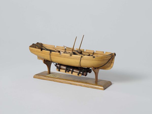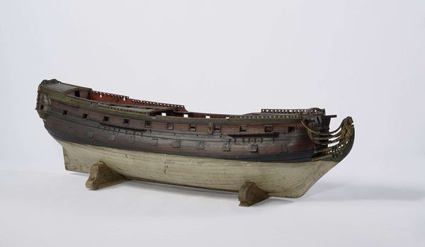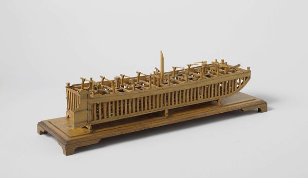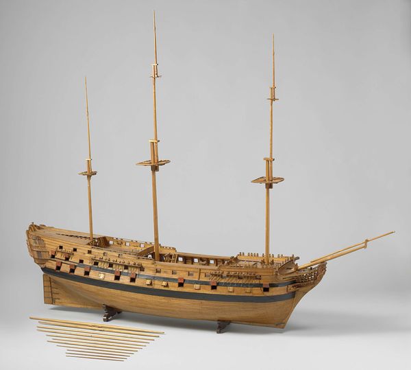 Curator: This intricate sculpture, titled "Model of an East Indiaman in Camels," dates back to 1742. The piece is composed of expertly carved wood. What are your initial impressions of this Baroque sculpture? Editor: I am struck by the incredible level of detail. It’s like looking at a skeleton, an exposed anatomy of commerce and maritime ambition. The color of the wood itself lends warmth to what otherwise could seem sterile, almost architectural in its precision. Curator: Precisely. The Dutch East India Company, or VOC, was at its zenith in this period. It controlled vast trade routes and exerted significant political influence. A ship like this embodies both technological prowess and economic imperialism. Note how every piece is rendered meticulously from the hull’s individual planks to the ornate carving around the prow. It’s an impressive show of artistic craftsmanship of its time. Editor: And it speaks to the baroque sensibilities. The play of light and shadow across the skeletal structure creates a rhythm. And those curves. Notice the interplay of rectilinear and curved forms to guide the eye. I would describe this wooden ship sculpture as a beautiful interplay of line, plane and texture. Curator: These details were not arbitrary; they were symbols of power. This model reflects how nautical power became intertwined with the exercise of the colonial governance in this period. The level of artistry that's on display in crafting this scale-sized ship really highlights how such craftsmanship itself becomes symbolic of economic strength of nations during that period. Editor: It’s certainly effective, regardless of its underlying motives. Viewing such objects compels one to delve beyond the surface charm, exploring the complex layers of human history, maritime endeavor and the rise of early international trade. Curator: Absolutely, reflecting on this piece has enriched my awareness about how commerce, art and colonial expansion interweave together. It helps in better understanding our interconnected global narrative. Editor: And seeing its structural, nearly diagrammatic form forces you to re-examine a wooden warship in all its complex material arrangements. There’s much to admire and dissect in this unusual model.