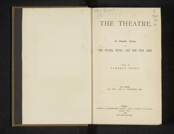 This is a bound volume of "The Theatre: A Monthly Review", edited by Clement Scott and published in London in 1884. Printed matter like this magazine reflects both the industrial processes of the late 19th century and the social context of arts and culture at the time. The cover showcases typography, engraving, and bookbinding—each involving specialized labor. The paper itself, likely made from wood pulp, suggests the rise of mass production and consumption. Consider the socio-economic dynamics embedded in this object: the factory workers producing the paper and ink, the skilled craftsmen operating the printing presses, the editors and writers contributing content, and the consumers engaging with the narratives within its pages. By recognizing the labor and materials involved, we gain insight into the cultural and economic forces shaping society during the late 19th century, and challenge notions of the artwork as a purely aesthetic creation.