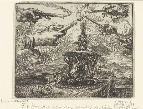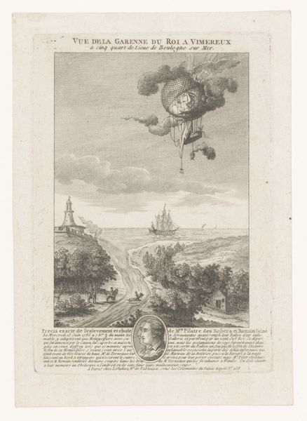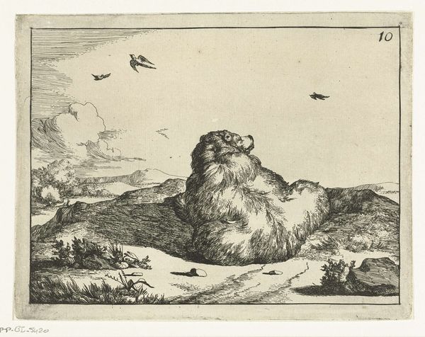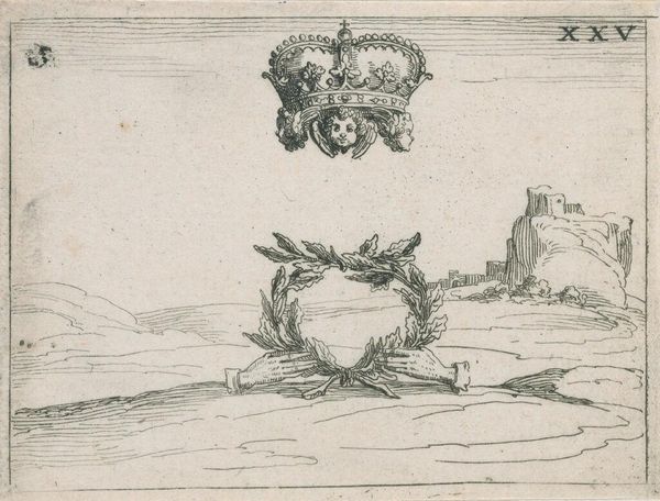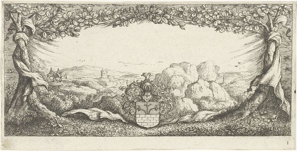 Curator: Jacques Callot, a printmaker active in the early 17th century, created this etching titled "Large Rock." Editor: The stark, almost skeletal, quality of the rock formations immediately strikes me. The etched lines create a dramatic play of light and shadow. Curator: Callot’s landscapes often served as backdrops for allegorical scenes, reflecting the political and social upheavals of his time. This rock, a seemingly unyielding form, could symbolize resilience. Editor: Note how the winding paths and tiny figures emphasize the rock's massive scale. The composition guides the eye upward, reinforcing a sense of awe and perhaps even human insignificance. Curator: The inclusion of ships, fortifications, and even heraldry suggests this isn't merely a landscape, but a commentary on power and dominion. Editor: Ultimately, it's the tension between the delicate linework and the imposing subject matter that makes this image so compelling. Curator: A fascinating insight into Callot's world and the enduring power of landscape to convey meaning.