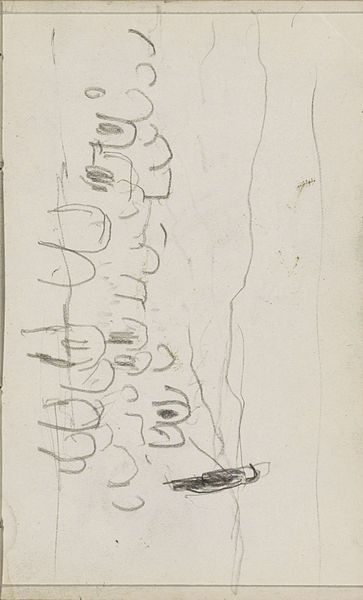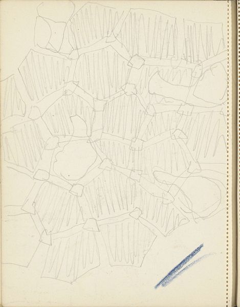 Curator: Here we have a piece from the Rijksmuseum collection: "Decoratief patroon met vierkanten," or "Decorative Pattern with Squares," a pencil drawing on paper by Reijer Stolk, dated circa 1916 to 1945. Editor: My immediate response is that this image feels somehow unfinished, even vulnerable, more of an idea in transit. Curator: Precisely. Look at the composition: the repeated squares, meticulously shaded with vertical lines, suggest order and structure. And yet, those sinuous lines threading through the squares disrupt the rigid grid. Editor: The lines introduce an organic element, almost like vines reclaiming the geometric space. Knowing this piece was created during a period encompassing both World Wars gives these competing elements a potent meaning, in my view. Curator: Expand on that a little. Editor: Consider the grid—it's the imposition of order, systems, the state itself perhaps. Then, consider how that very grid is subverted by unpredictable and almost insurgent free-flowing lines; for me, it evokes the spirit of resistance or the resilience of natural forms in a time of intense societal pressure. Curator: A compelling reading! From a purely formal perspective, I observe a clear tension between precision and spontaneity. The density of shading in the squares contrasts with the spare, almost hesitant quality of the curved lines. It’s a dialogue within the work itself. Editor: And Stolk chose simple materials--pencil and paper--lending accessibility to a period fraught with division. In essence, anyone, regardless of their place in society, could find the space for artistic expression as resistance. Curator: What I value here is its simplicity, the almost diagrammatic nature of the pattern, and its appeal to modernist sensibilities exploring the relationships between form and space. Editor: Absolutely, and recognizing the period when this work was conceived illuminates these seemingly neutral elements in ways that enrich our engagement with it, making space for personal understanding and empathy.