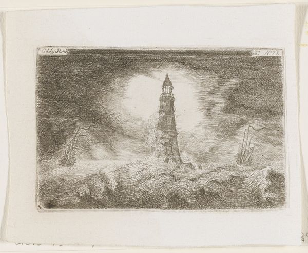 Curator: Lodewijk Schelfhout's "Kathedraal," created in 1919, uses etching to present a rather striking cityscape. The piece resides here at the Rijksmuseum. What strikes you initially about it? Editor: There's a powerful, almost brooding atmosphere. The dark, looming sky contrasted with the illuminated cathedral… it’s definitely not your typical sunny landscape. It feels ominous. Curator: Indeed. And that very tension speaks volumes about the socio-political climate in Europe at the time. The etching was made just after the First World War. Symbolism was burgeoning then, reflecting anxieties and perhaps even a crisis of faith. Consider the cathedral; is it a beacon of hope or a monument of outdated authority? Editor: I see your point. The placement of the cathedral, dominating the town below, could represent institutional power structures. The artist almost traps the town. But what is interesting is the gate, centrally located. Perhaps there is another option available to those that wish to pass through. The role of art itself – prints were often more accessible than painting – becomes critical. They could disseminate messages widely, inviting debate. Curator: Precisely. Moreover, etchings like this were often distributed and collected among burgeoning artistic and intellectual circles. Schelfhout places the viewer in a position to think about cultural and societal values, opening it up to question structures. Editor: The city looks to be caught between this beautiful landscape but weighed down. It reflects on how artists saw urban development encroaching into what they saw as untouched nature. Curator: It does provoke reflection on rapid change and the challenges inherent in progress, wouldn’t you agree? Editor: Absolutely. Thank you for prompting that view; a fascinating piece that shows both beauty and uncertainty. Curator: My pleasure. I am left pondering how artistic expressions often mirror the anxieties of a specific time period, offering an entry point for re-examining historical conditions.