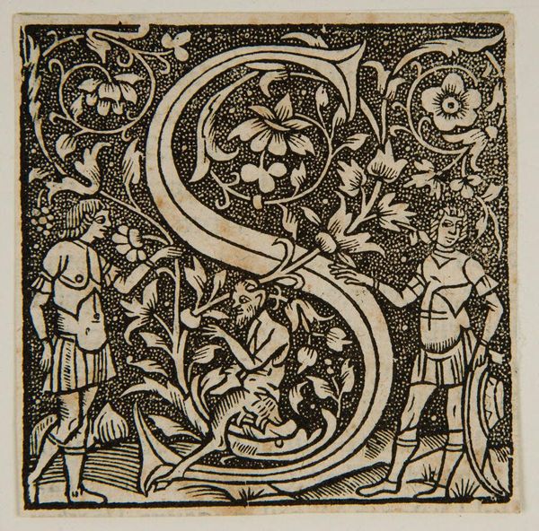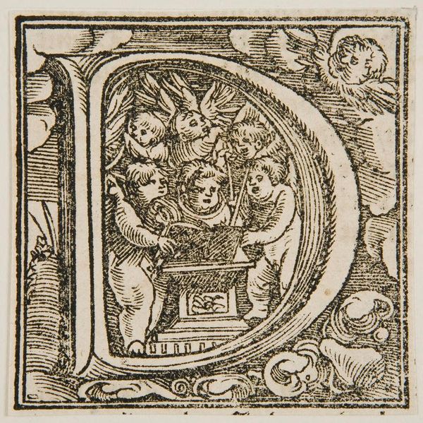 Curator: Here we have an anonymous piece, "Letter D with Nativity," housed at the Harvard Art Museums. Editor: It’s a dense composition, isn’t it? The sharp contrast of the linework definitely creates a somber, almost austere mood. Curator: Right, the visual language speaks to a fascinating moment in print history. The Nativity scene is framed by the letter "D," which offers a glimpse into the role of religious imagery in literacy and social structures. Editor: The composition, though small, draws the eye across the surface. The artist masterfully uses varied line weights to create depth. Curator: Indeed, and the inclusion of religious iconography speaks volumes about the socio-political context of the period, reflecting societal values and religious power dynamics. Editor: I see how the image functions as a microcosm of artistic technique, devotional expression, and cultural ideology. Curator: Absolutely, a powerful encapsulation. Editor: A convergence of form and meaning.
